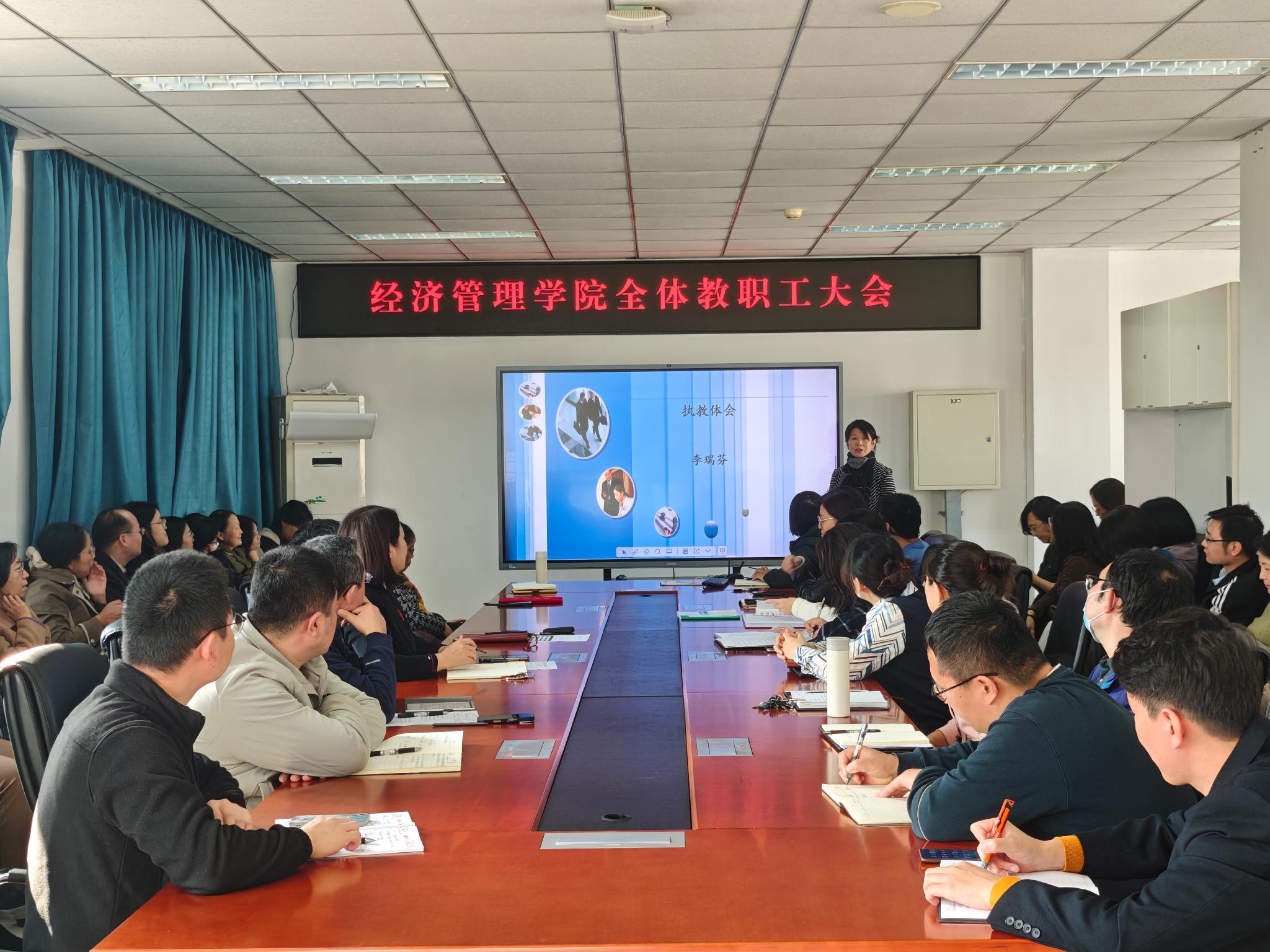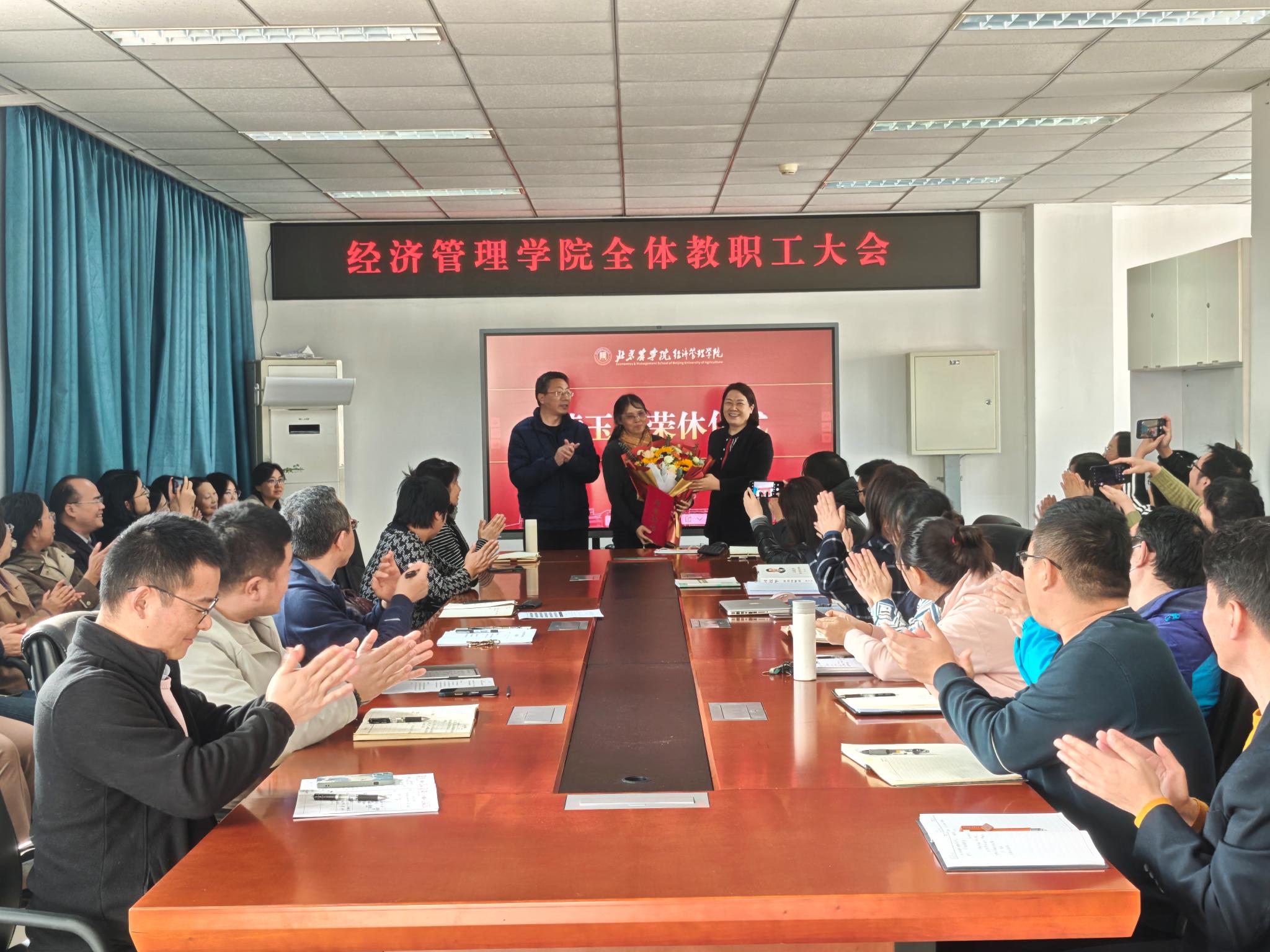 在经管楼401会议室举行全体教职工大会,隆重举行黄玉梅老师荣休仪式,特邀李瑞芬老师分享育人故事,并部署近期重点工作。会议由学院党委书记刘芳主持,全体教职工齐聚一堂,共同见证荣耀时刻,汲取育人智慧。