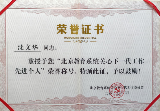 沈文华教授获评“北京市教育系统关心下一代工作先进个人”荣誉称号