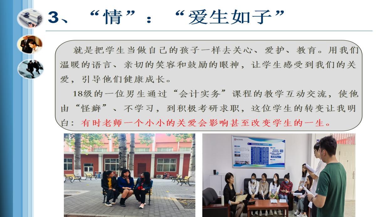她记得《会计实务》课上曾有一位男生,在分组时怯生生地请求独自成组。李老师没有简单同意,而是私下找他深谈。起初学生不愿多说,在她温和的引导下,才吐露了因为性格内向、成绩一般而被同学疏远的孤独。李瑞芬老师开始有意识地多与这位男生沟通,主动辅导功课,鼓励他尝试与同学交流。期末,这位学生的成绩不错,脸上也渐渐有了自信的光彩。后来,他主动加了李瑞芬老师的微信,在考研、求职的路上,仍时常向她请教。“这件事让我明白,有时老师一个看似微小的关爱,真的可能影响甚至改变一个学生的一生。”